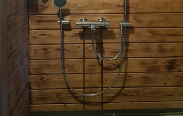 The old log house has, of course, a large kitchen with a large wooden table and a fireplace that can be used as a hearth, as well as a wood stove. There is a water point in the kitchen, where cold and hot water comes from a bore well. An air source heat pump is in the kitchen for heating and cooling. There is a 140 cm wide sofa bed in the kitchen.